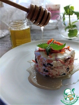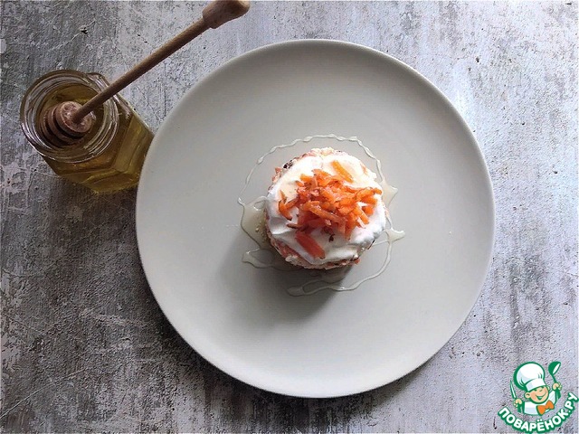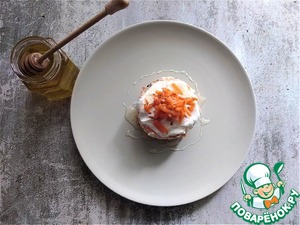 Для подачи верх салата обмажу сметаной и выложу немного натёртой моркови, полью мёдом.