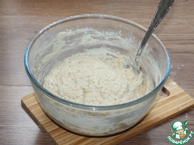 Дрожжи (1 ч. л.) смешиваем с 3 ст. л. муки и с 1 ст. л. сахара. Добавляем теплую воду (60 мл) и перемешиваем венчиком. Ставим миску с опарой в теплое место до появления пенной шапочки, минут 30.