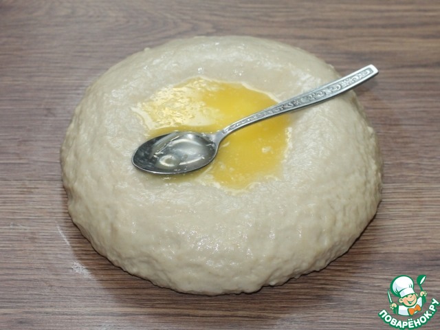 3. Подпыляем столешницу мукой и выкладываем тесто. Подмешиваем оставшуюся муку и собираем тесто в ком. В середину теста кладем мягкое сливочное масло или растопленное и охлажденное. Льем на масло 1 ч. л. уксуса и вмешиваем масляную смесь в тесто.