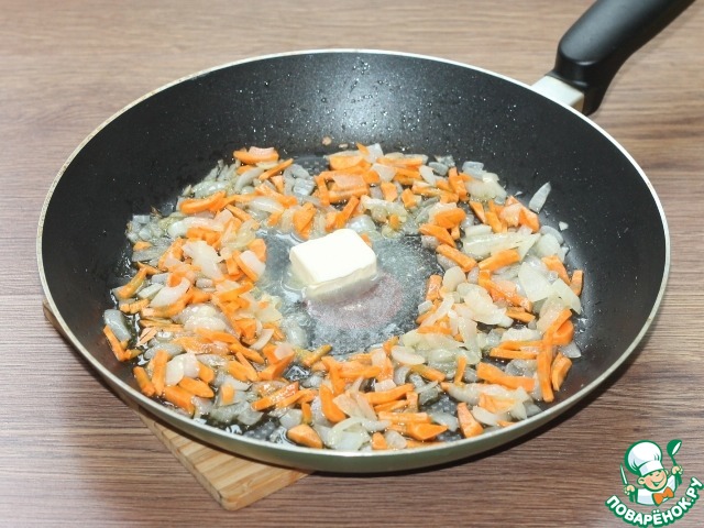 9. На растительном масле обжариваем лук и морковь, минуты 3. Растапливаем сливочное масло и выливаем 100 мл воды.