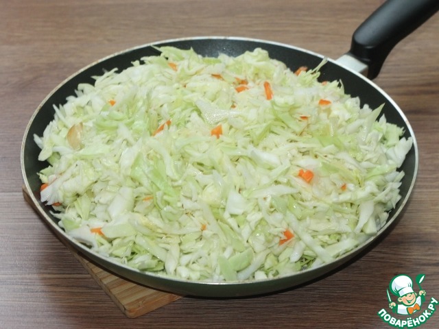 10. Добавляем к пассеровке капусту, солим, можно добавить приправу для овощей ("итальянские травы"). 10 минут обжариваем под крышкой и 10 без крышки до испарения жидкости.