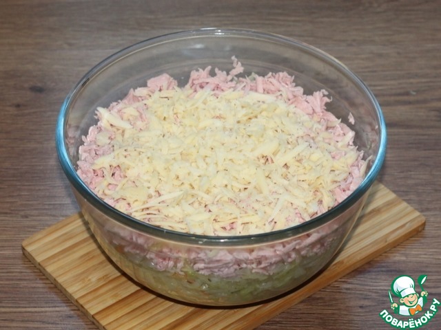 8. Подготовим продукты. Трем на крупной терке сыр и колбасу. Лук, капусту и морковь нарезаем.