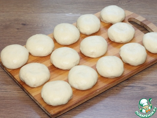 12. Тесто обминаем, взвешиваем (у меня 980 г) и делим на 14 частей. Каждую часть теста округляем.