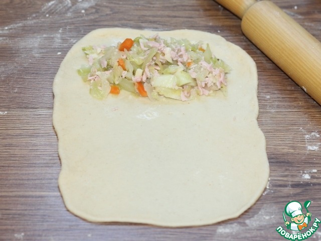 13. Раскатываем каждый шарик теста в лепешку и кладем начинку, 2 ст. л..