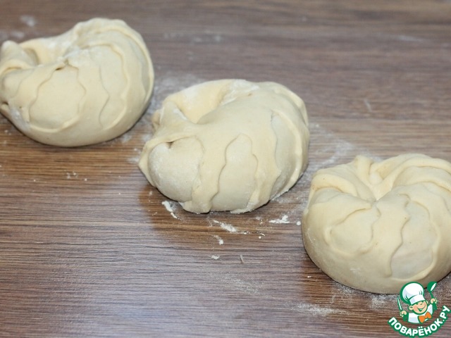 15. Формируем пирожок-булочку. Выкладываем пироги на застеленный противень или как у меня в формочку (не смазывала маслом).
