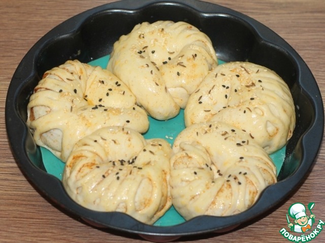 17. Затем смазываем пироги взбитым желтком и посыпаем тмином или кунжутом.