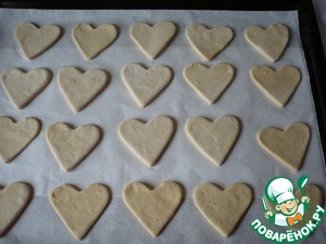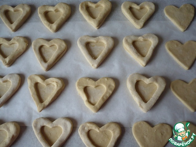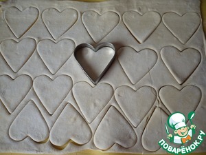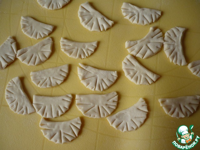 Круглой вырубкой вырезать из остатков теста кружочки, диаметром около 4 см. Каждый кружок разрезать пополам.