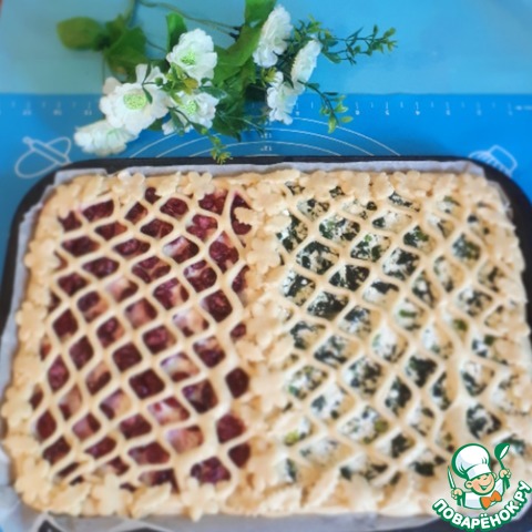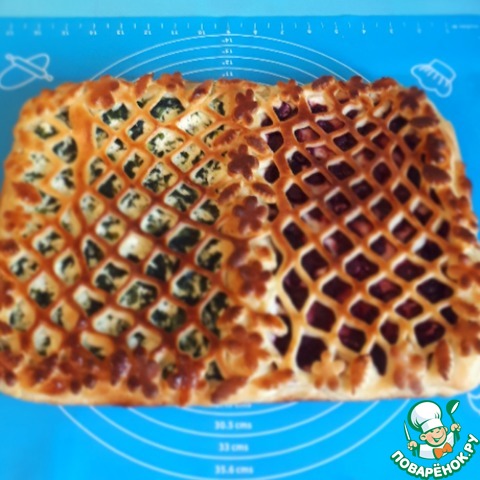 На одну половину пирога положить начинку творог- шпинат, на вторую сначала положить торожную начинку, а сверху распределить вишню в крахмале.