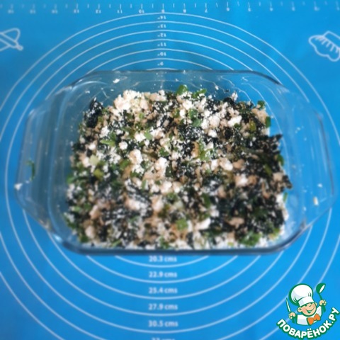 Подготовим начинки. Шпинат предварительно разморозить, отжать лишнюю воду и нарезать произвольно на кусочки. Зеленый лук тоже нарезать мелко.