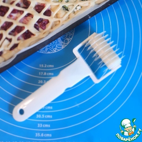 Раскатанное тесто распределить по противню, сделать небольшие бортики, из полоски сформовать перегородку, разделяя пирог на две части.