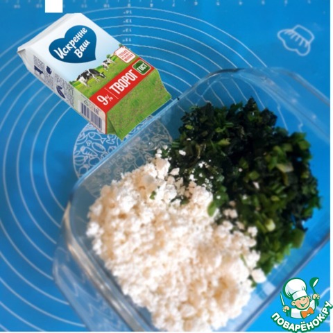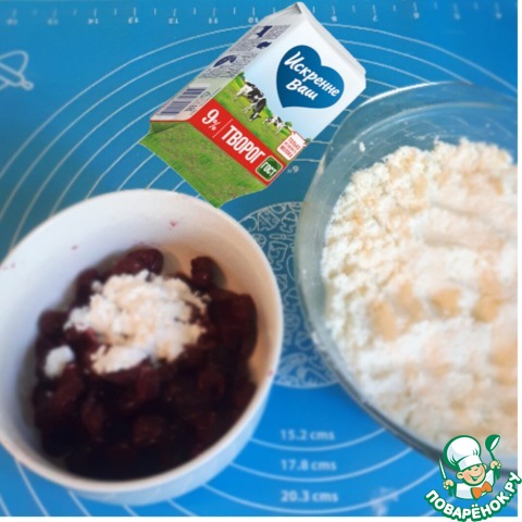 Вишню предварительно разморозить, дать соку стечь, добавить крахмал. В творог добавить сахарную пудру, яйцо, ванилин, все перемешать.