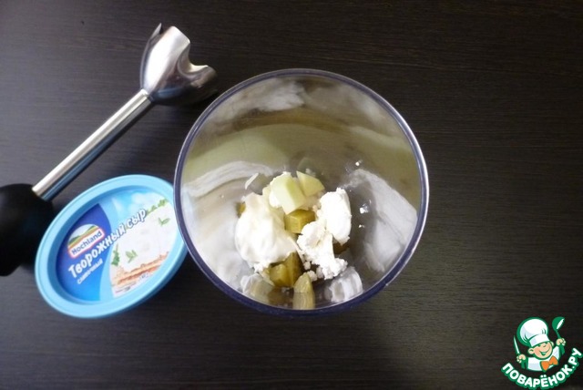 С яблока счистить шкурку. Если у соленого огурца шкурка толстая, то её тоже лучше счистить. Нарезать кусочками и отправить в блендер вместе с другими ингредиентами.
