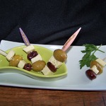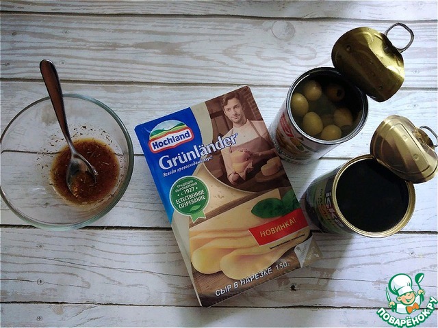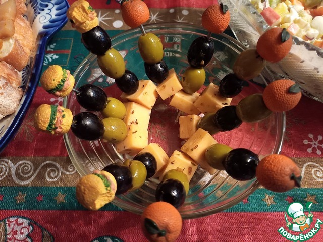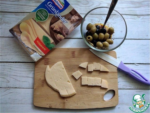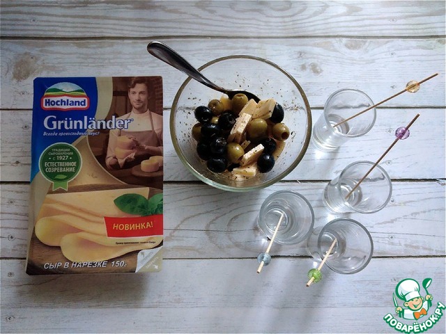 Для закуски использую зелёные оливки и чёрные маслины, сыр в нарезке.