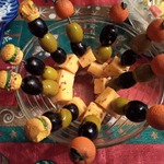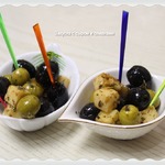 Я буду подавать закуску индивидуально в рюмках 70 мл, приготовлю сразу шпажки на каждую рюмку. Возьму оливок и маслин из расчёта 3 шт оливок и 3 шт маслин на рюмку. Количество кусочков сыра тоже распределю на 4 рюмки.