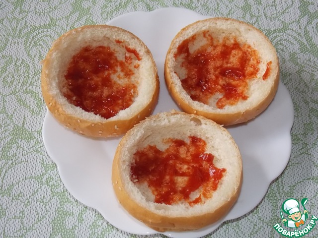 Булочки разрезать пополам, в нижних частях убрать мякиш, сделать чашечки.