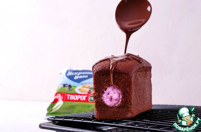 Шоколадный кекс и творожно-ягодная начинка-крем, а сверху толстый слой шоколадной глазури. Этот десерт - настоящий рай для любителей шоколада. Получается маленький тортик, который удобно резать на порции, и выглядит он необычно.