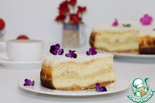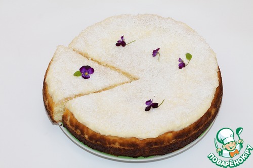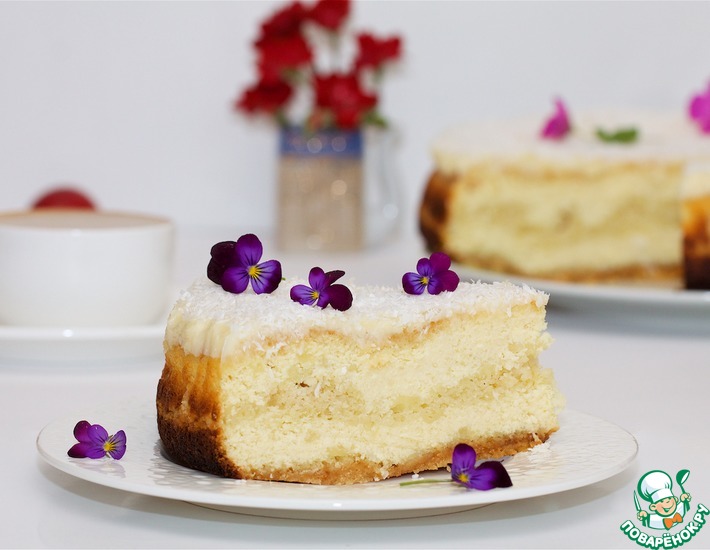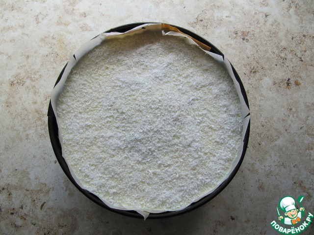 Сверху посыпать пирог кокосовой стружкой, оправить в духовку минут на 10, снизив температуру до 150-160 С. Пирог охладить до теплого, освободить от формы, переложить на решетку до полного охлаждения.