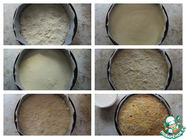 Дно, бока разъемной формы для выпечки (диаметром 20 см) застелить бумагой для выпечки. На дно формы насыпать слой масляно-мучной крошки (1/3 часть), вылить 1/2 часть творожного слоя, высыпать второй слой масляно-мучной крошки, затем вылить оставшуюся 1/2 часть творожного слоя, сверху высыпать оставшийся слой масляно-мучной крошки. Выпекать в предварительно разогретой до 180 С духовке до готовности (примерно 50-60 минут).