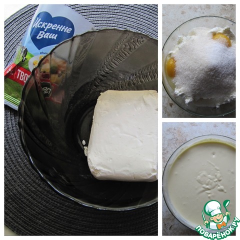 Для приготовления творожного слоя пробить блендером до гладкого, однородного состояния творог ТМ "Искренне Ваш", сахар, ванильный сахар, яйца.