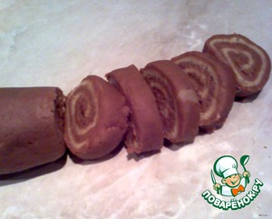 А это рулетик. Тут проще! Раскатываем белое тесто, на него кладем шоколадное, потом белое снова и скручиаем рулетом,