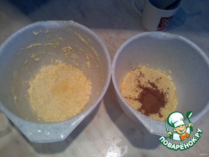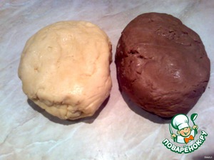 Делим смесь на 2 равные части - в одну добавляем ванильный сахар, в другую 1 ч. л. какао. И по стакану муки в одну и другую части.