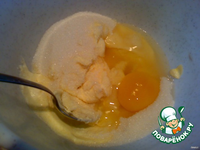 Перетираем размягченный маргарин с сахаром и 1 яйцом