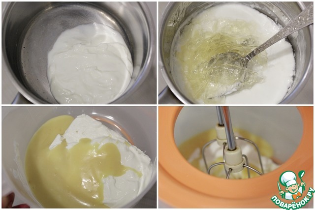 Листовой желатин выложить в тарелку и залить ледяной водой. Чем меньше желатина, тем нежнее текстура, чем больше желатина – тем плотнее десерт, ближе к желе.