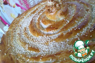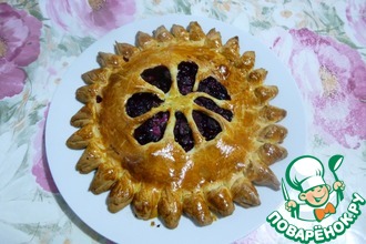 На центральную часть выложить начинку, от краев по 1-2 см лучше отступить. Накрыть начинку пластом теста с правой стороны, защепить края, выложить оставшуюся начинку, накрыть пластом теста с левой стороны, защитить края.