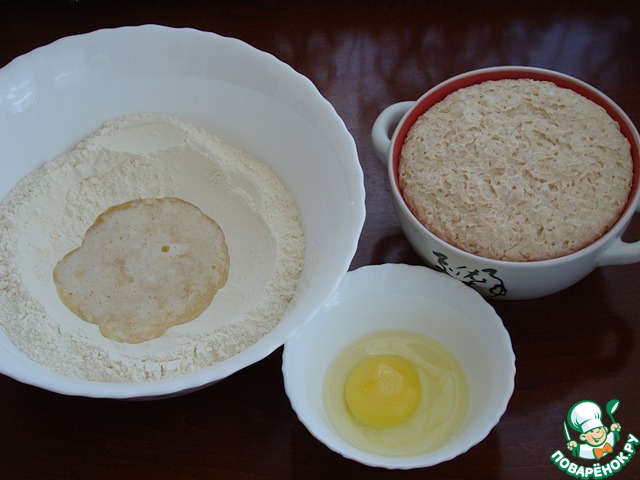 В миску просеять муку, добавить остальную часть сахара, по щепотке соли и ванилина. Влить растопленное сливочное масло, добавить куриное яйцо и влить подошедшую дрожжевую смесь. Замесить тесто.