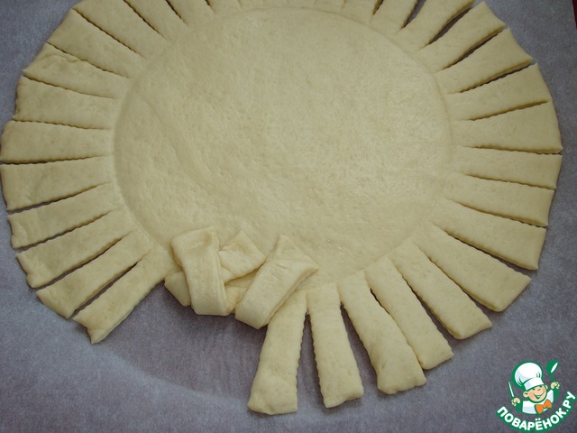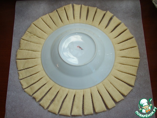 В середину уложите крышку, тарелку или любой круглый предмет, и сделайте по всему кругу надрезы, шириной 1,5-2 см.