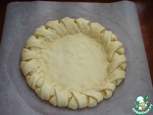 Тесто раскатать в большой круг (лучше это сделать сразу на коврике или бумаге для выпечки). Диаметр моей ватрушки - 32 см, толщина 0,7 см.
