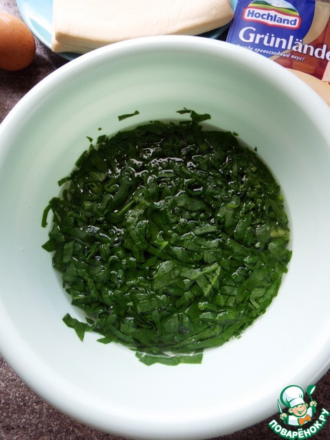 Шпинат мелко нарезать, залить кипятком. Через пару минут слить воду и отжать.
