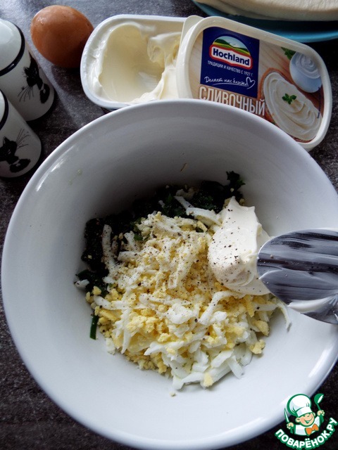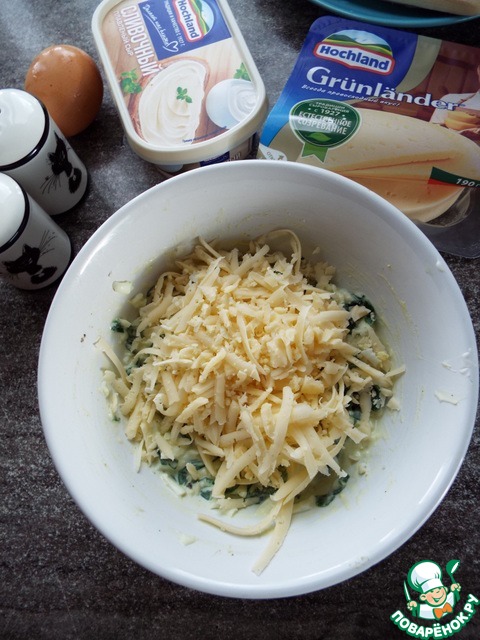 Добавить к шпинату, натёртое на крупной тёрке, яйцо и плавленный сыр.