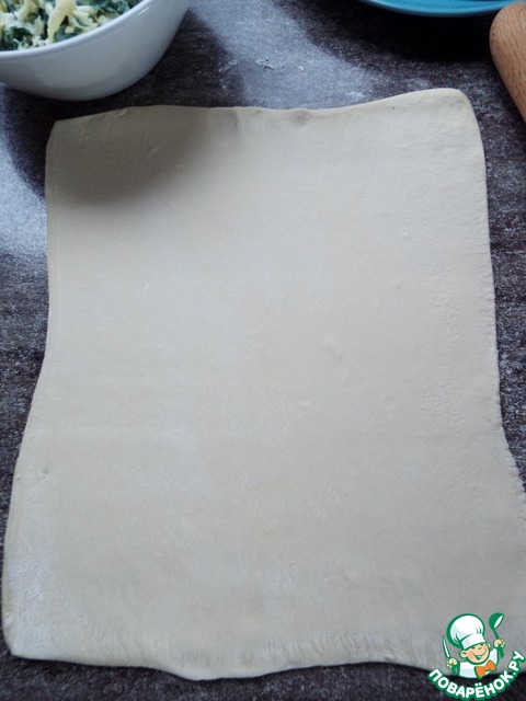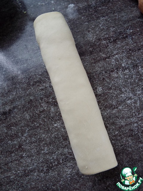 Тесто раскатать (не тонко) в прямоугольный пласт.
