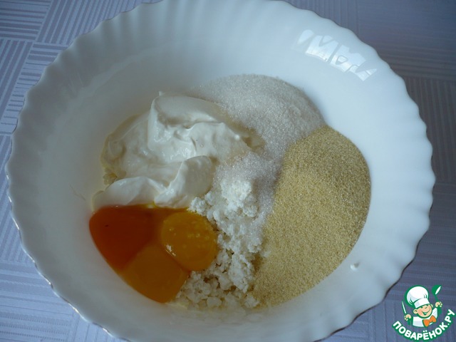В творог добавляем яичные желтки, сметану, сахар, ванильный сахар и манную крупу. Все хорошо перемешиваем.