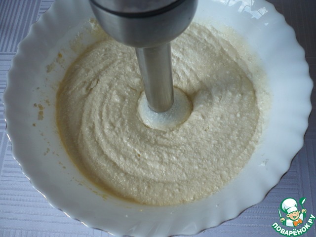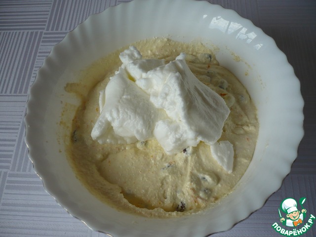 Берем яичные белки, к ним добавляем щепотку соли и взбиваем до устойчивых пиков. Перекладываем их в творог (белки придадут запеканке дополнительную пышность) и аккуратно, снизу-вверх соединяем с основной творожной массой.