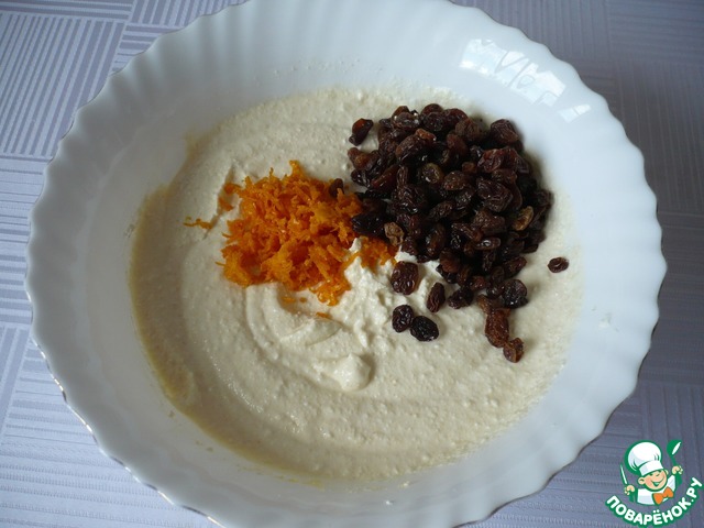 Теперь добавляем в творог изюм и цедру апельсина. Перемешиваем и творожную массу пока отставляем в сторону.
