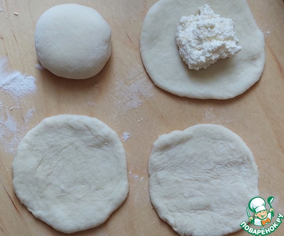 Вернёмся к оставшейся части теста. Разделить на 6 частей. 5 частей раскатать в круг. В центр каждого разложить оставшуюся начинку. Защипать края круша, сформировать шарики.