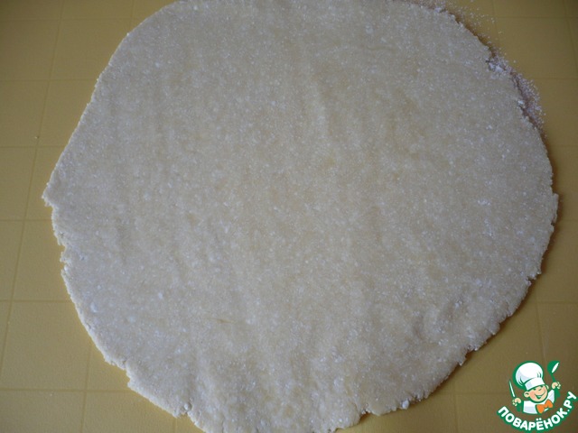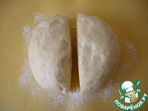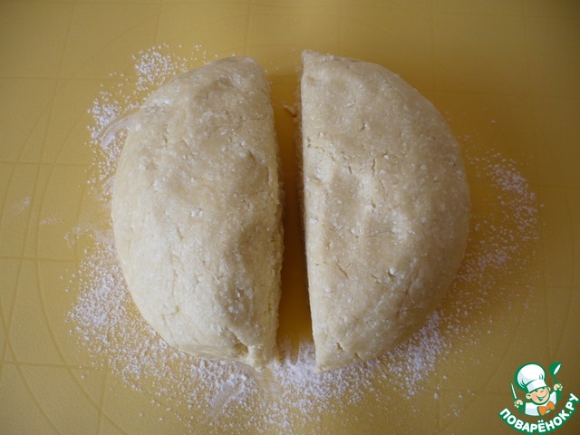 Поверхность стола присыпать мукой и один кусочек теста раскатать в пласт толщиной ~ 3-4 мм, а затем раскатать и другой кусочек теста.