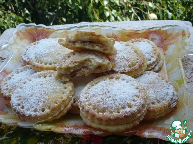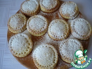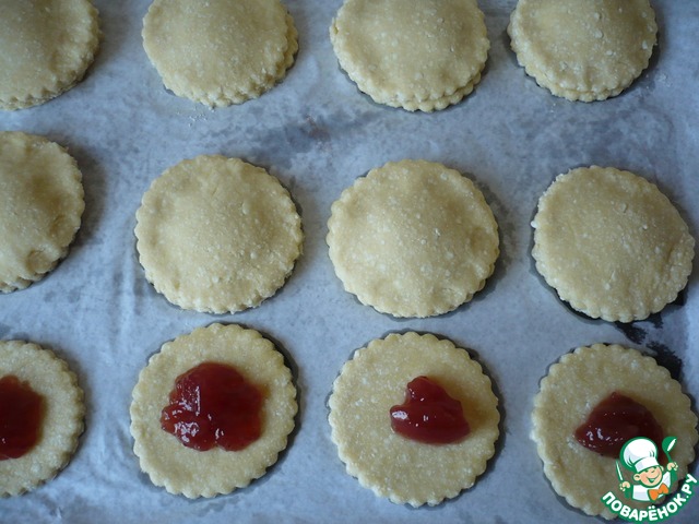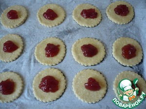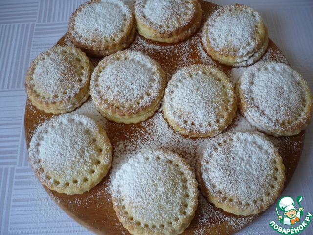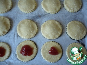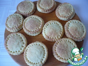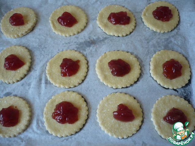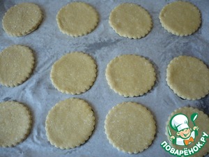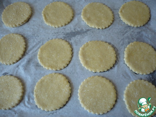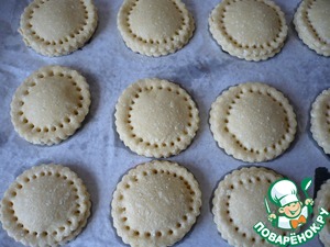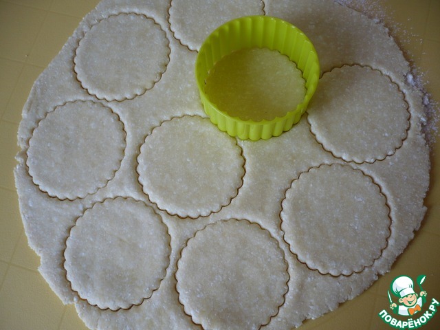 Вырубкой для теста вырезать кружки d - 7 см, на обоих пластах. Нужно, чтобы получилось парное количество кружков. У меня их получилось 24 штуки.