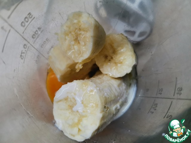 Кладём в чашу миксера банан, разбиваем яйцо, наливаем кефир, а затем добиваемся однородности погружным блендером.
