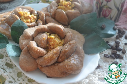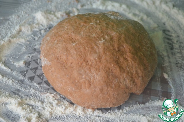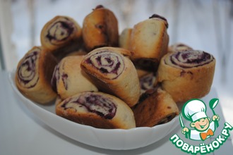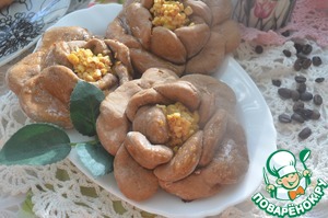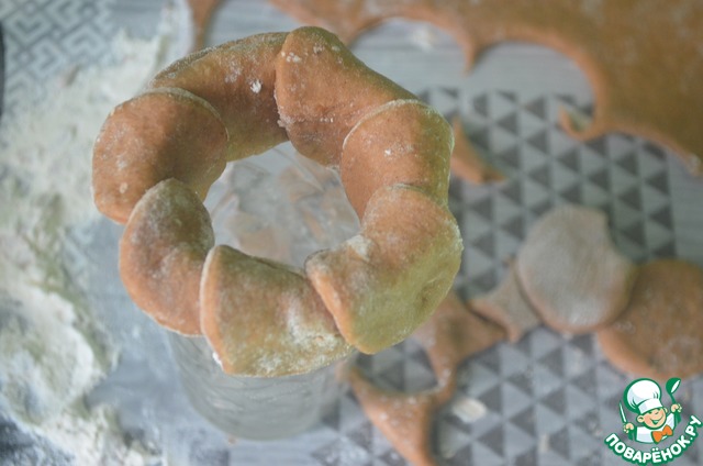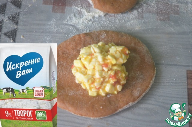 Из теста стаканом вырезать большой круг, слегка его раскатать, на середину выложить начинку из творога