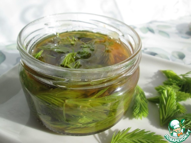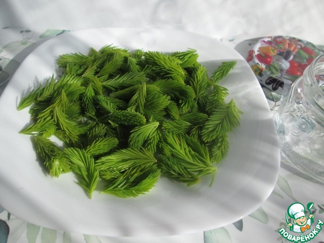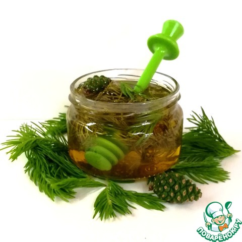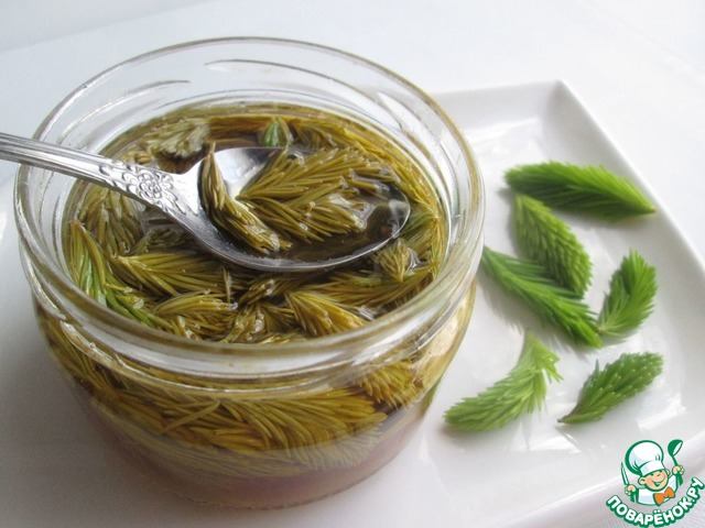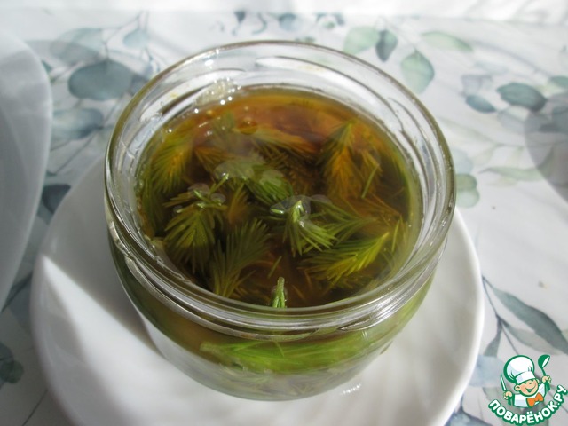 Точное количество еловых побегов и мёда не указываю, а просто покажу как мы делаем заготовку на примере заполнения одной баночки. Её предварительно надо простерилизовать и охладить.