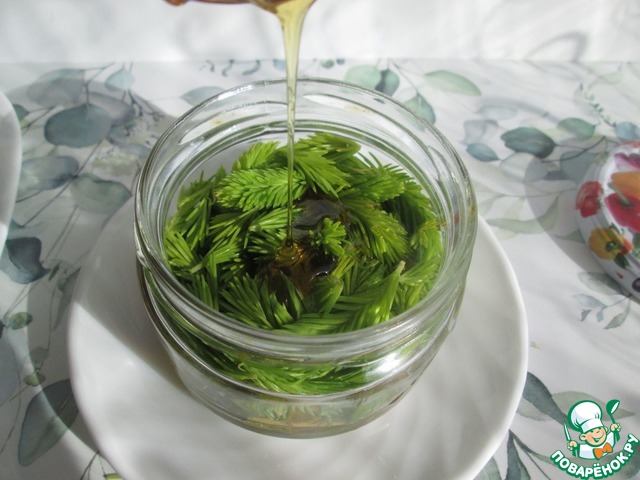 Сколько понадобится мёда, выяснится в конце приготовления, а сначала на дно банки добавить 1 ст. л. мёда и заполнить банку еловыми побегами. Плотность укладки по вашему желанию, но лучше поплотней. Затем понемногу добавлять мёд.