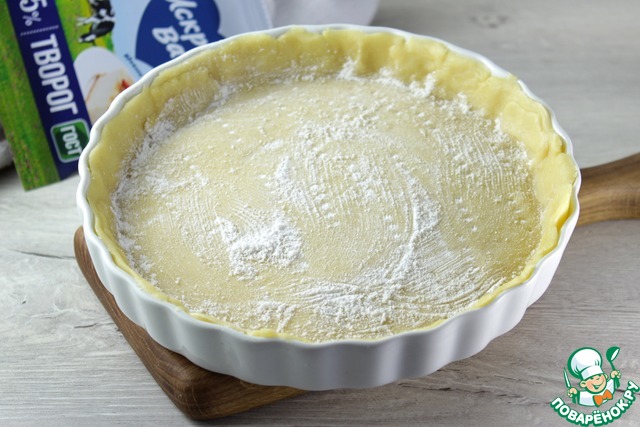 Тесто раскатать в пласт толщиной около 2-3 мм, выложить в форму для выпечки, формируя бортики. Низ основы из теста наколоть вилкой и посыпать крахмалом.