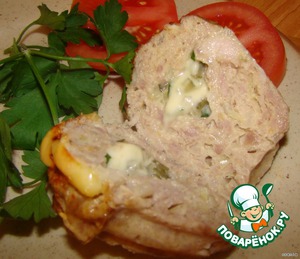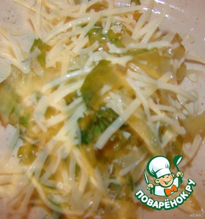 Начинку я взяла двух видов.. половину котлет я начинила смесью из тертого сыра.. мелко порезанного, соленого огурца и зелени.