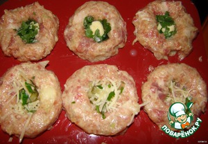 Фарш смешайте с мелко порезанным луком, яйцом, горчицей, майонезом, хлебом. Посолите, поперчите и добавьте любимые приправы.. Сформируйте мокрыми руками котлеты.. и поместите их в формы для мафинов.. в середине морым пальцем сделайте ямку и поместите начинку