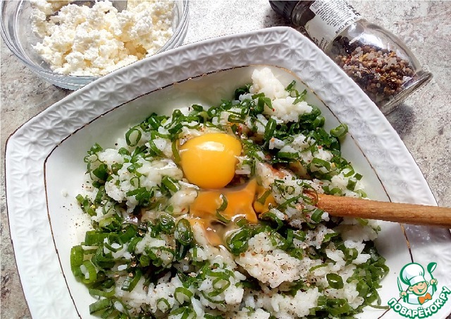 Приготовить начинку: соединить яйца с творогом и растопленным сливочным маслом, добавить измельченный зелёный лук, треть натёртого сыра, приправить солью и перцем (я использовала смесь перцев) и перемешать. Творожную начинку выложить в форму с тестом, посыпать изделие оставшимся сыром.