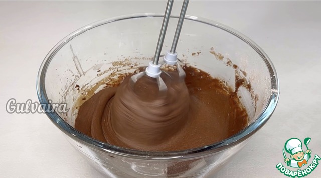Далее просеиваем муку, разрыхлитель, и какао. Перемешиваем до однородности.