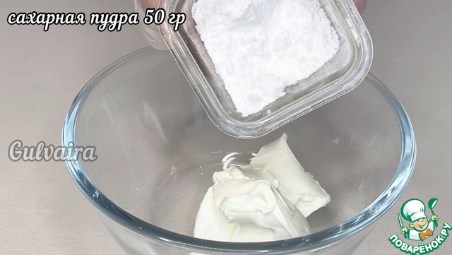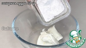 Далее взбиваем блендером творожный сыр с сахарной пудрой. Затем постепенно добавляем сливки. Взбиваем до того, пока масса не загустеет. Крем перекладываем в кондитерский мешок.